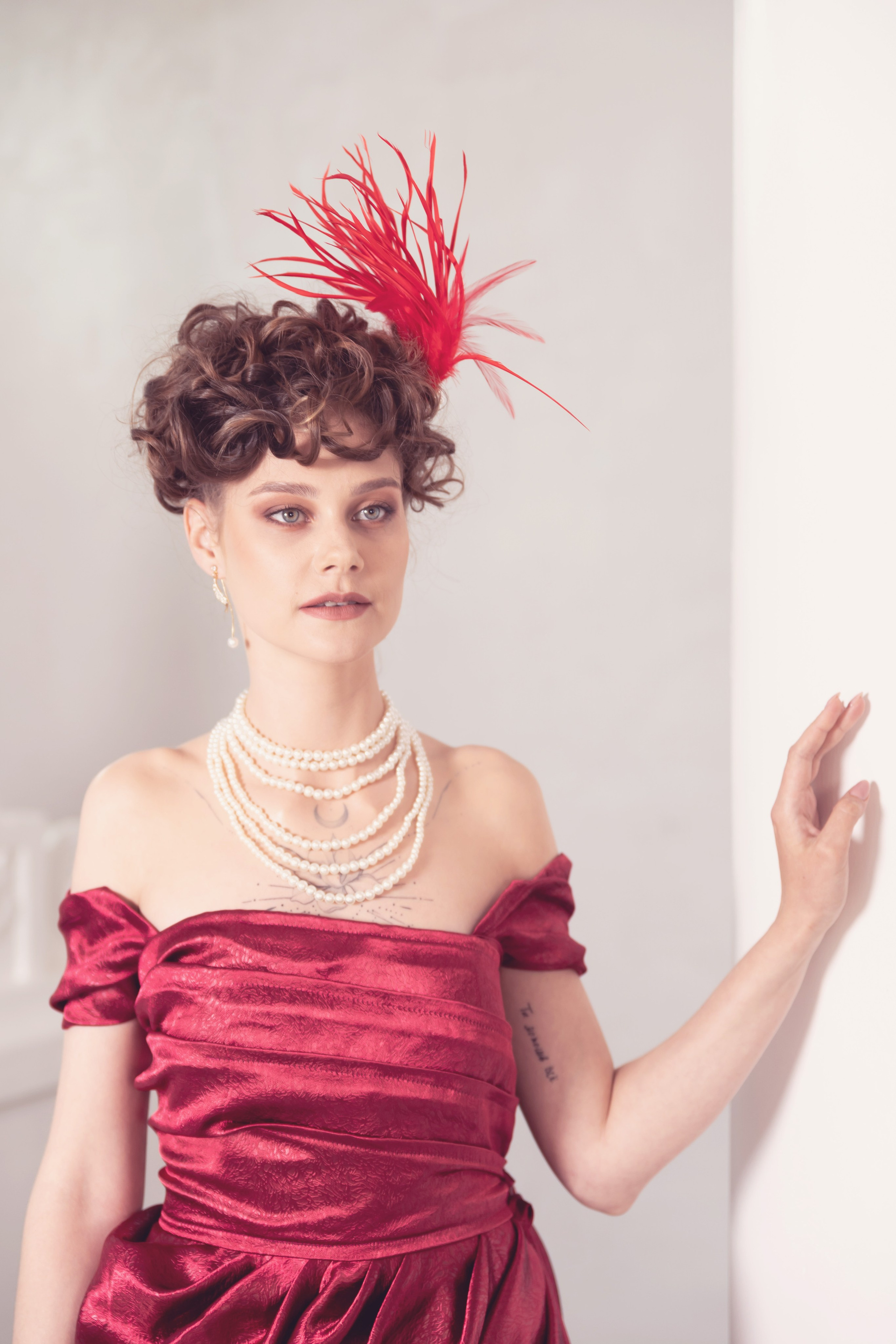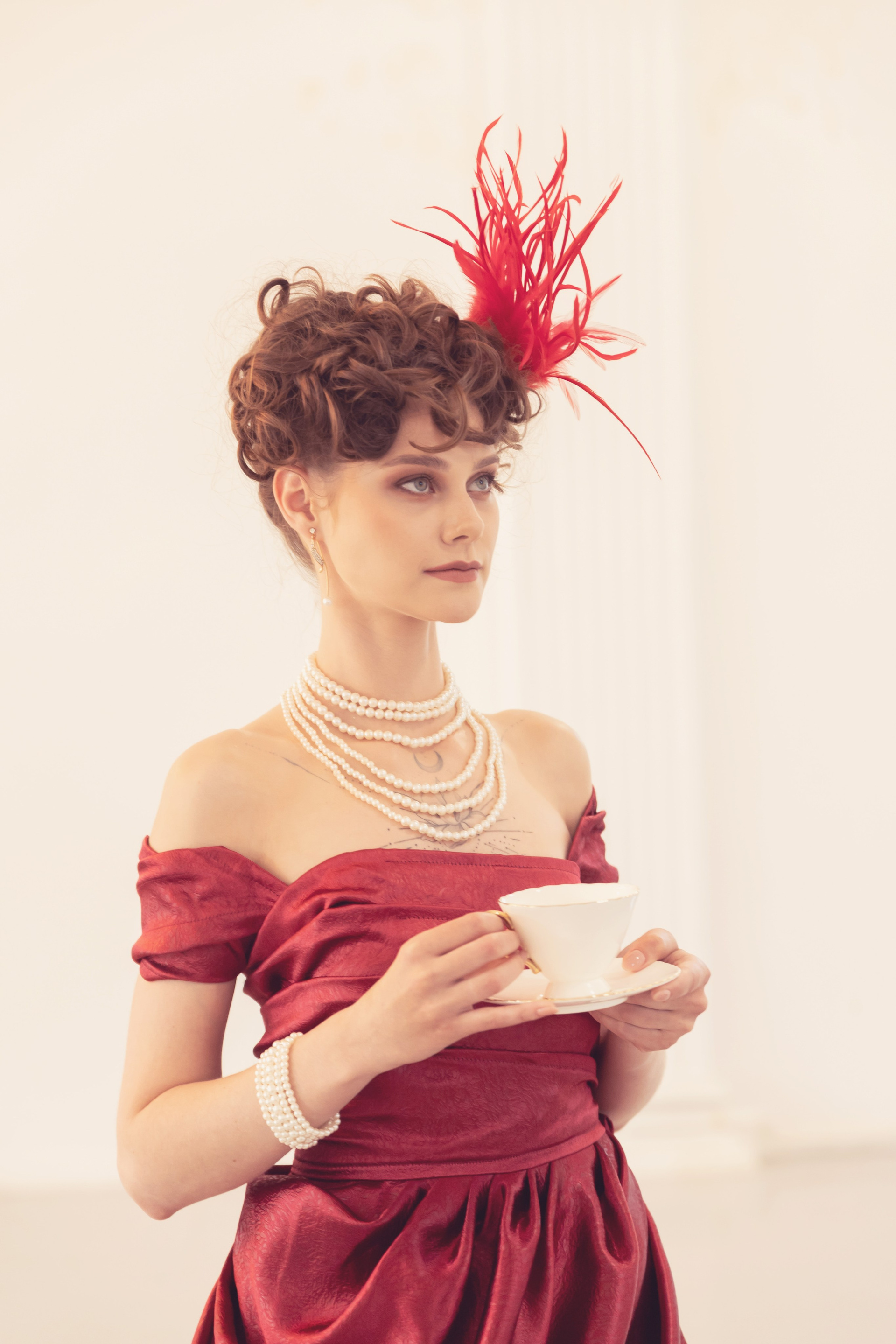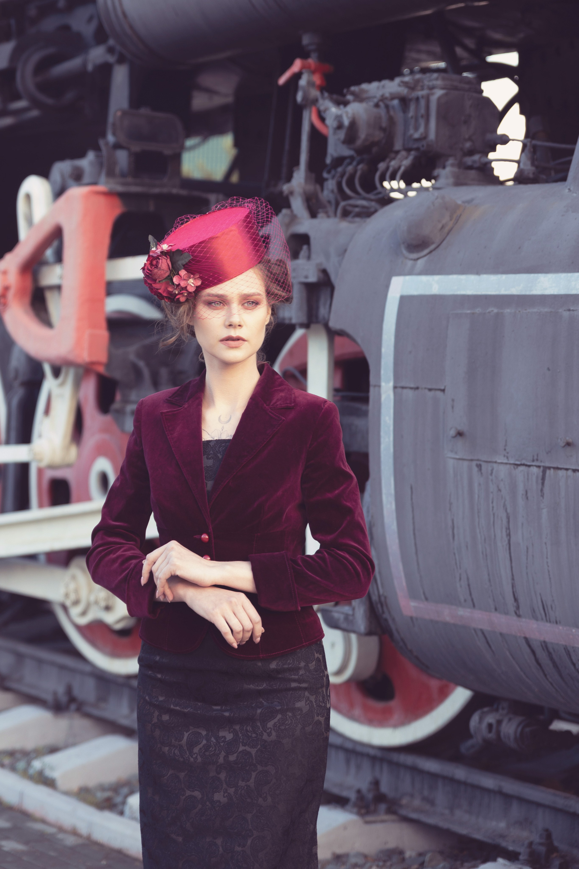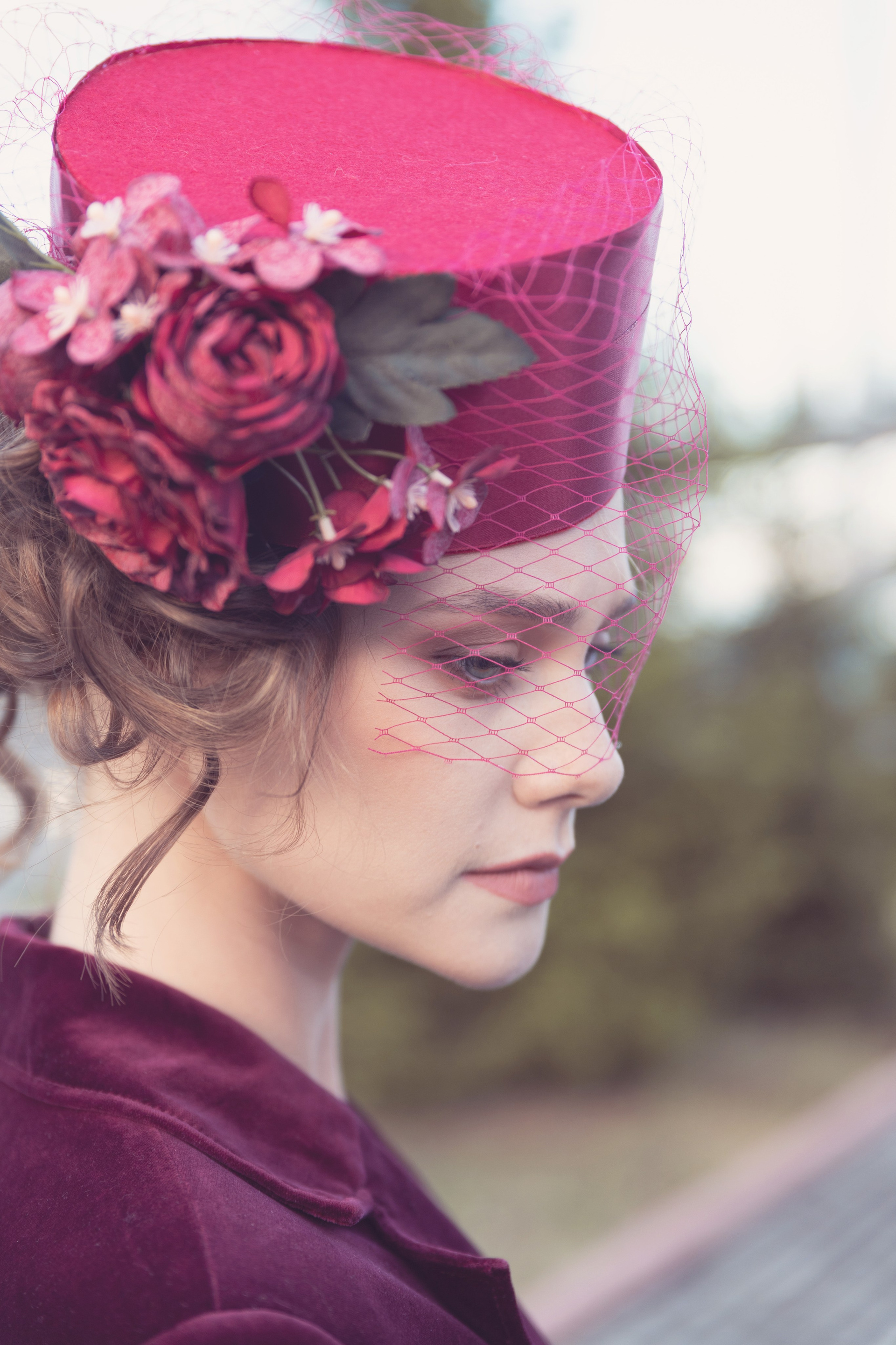 Яркая шляпка цвета спелой вишни с вуалью и цветами — словно пульс её страсти, отблеск внутреннего пламени, которое не скрыть под шелком приличий.