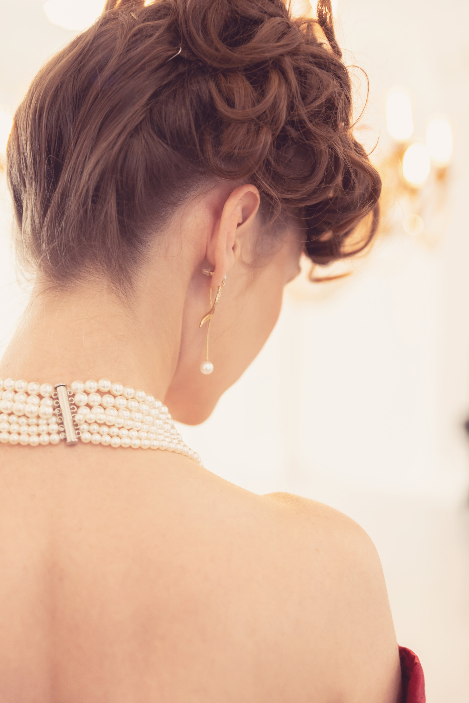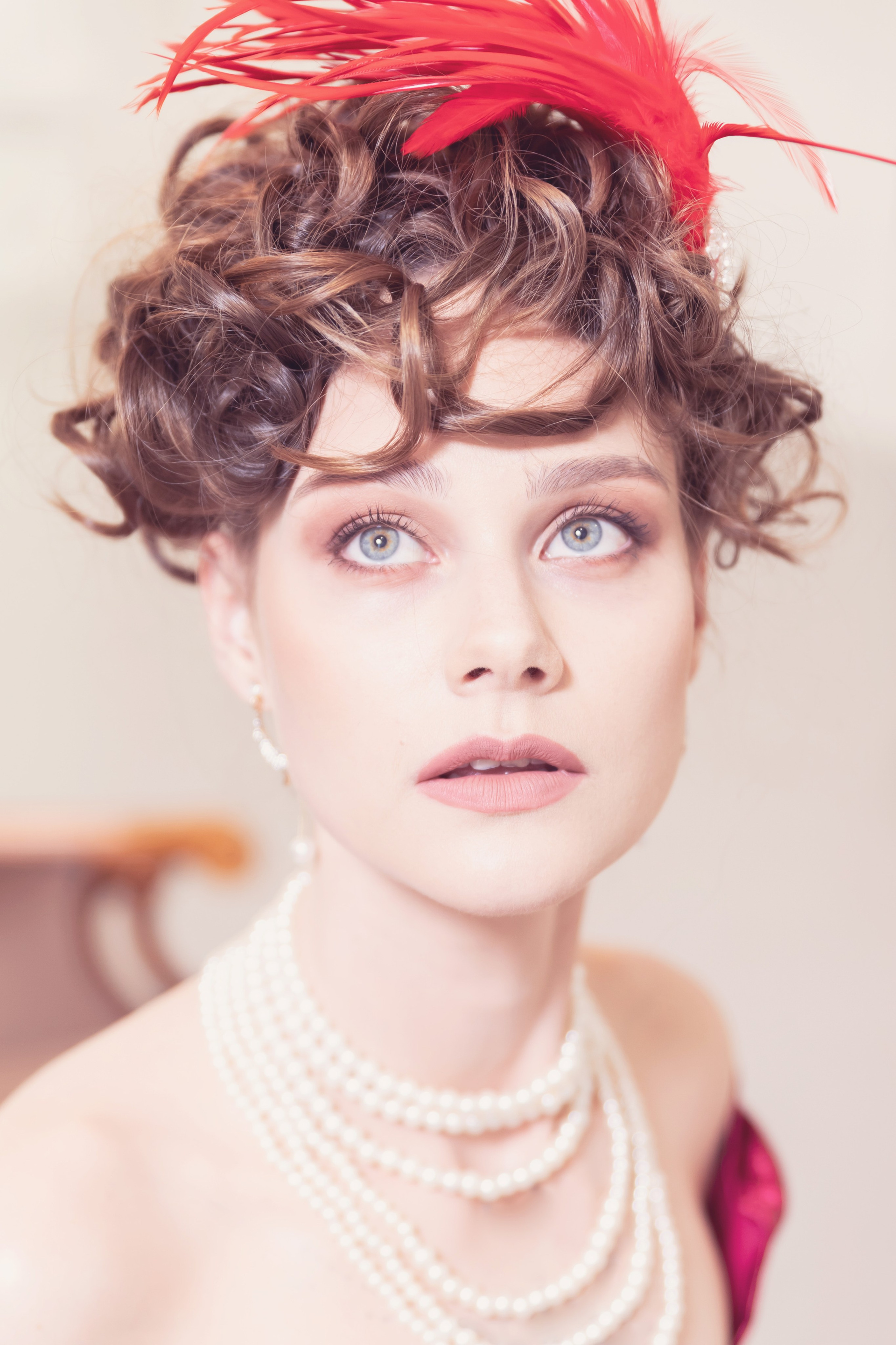 На шее — многослойное жемчужное ожерелье, сияющее словно слёзы, превращённые в красоту. Волосы уложены в кудри, увенчанные алым пером — вспышкой страсти и рокового выбора. Макияж подчёркивает задумчивый, почти трагический взгляд.