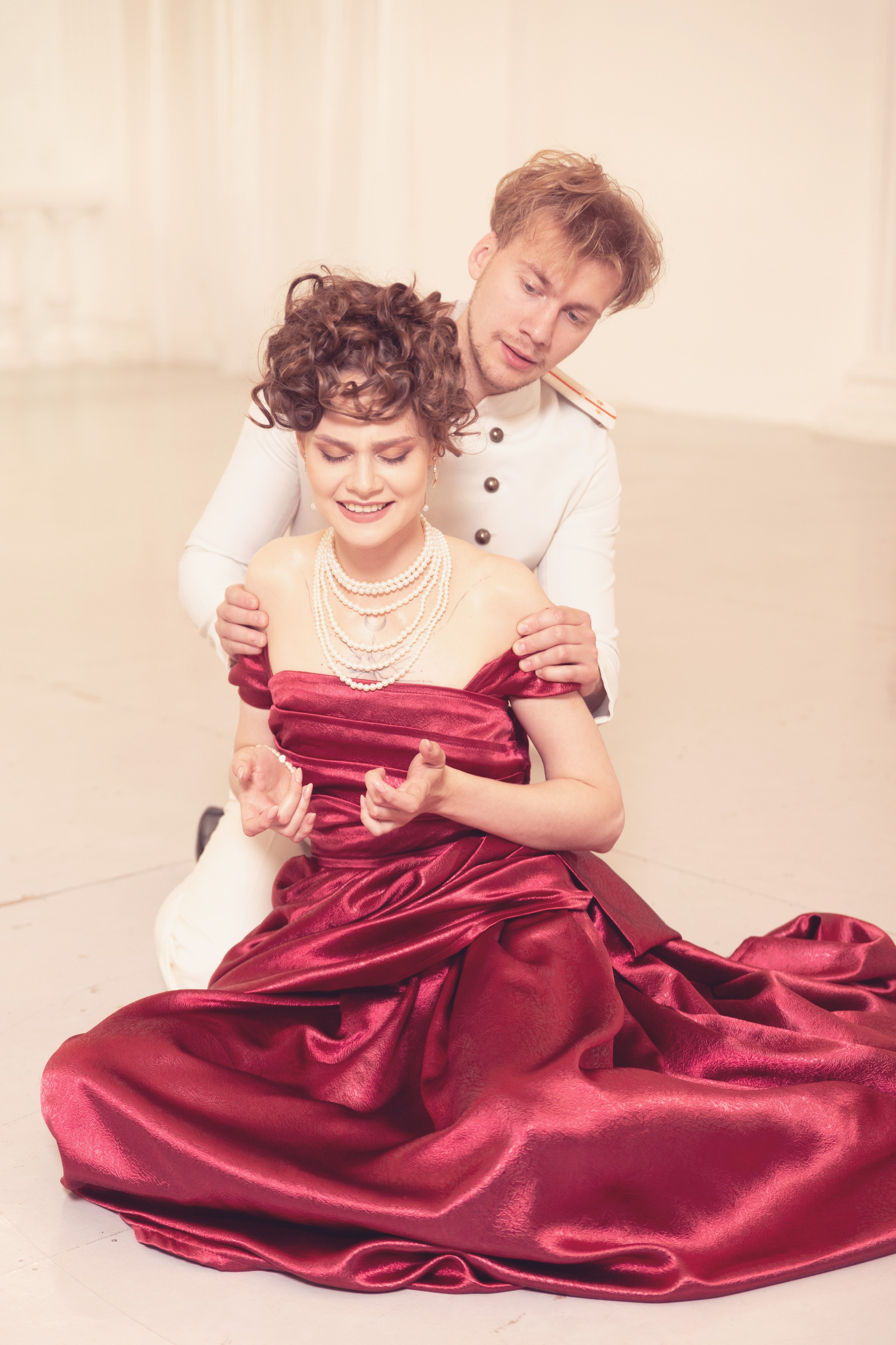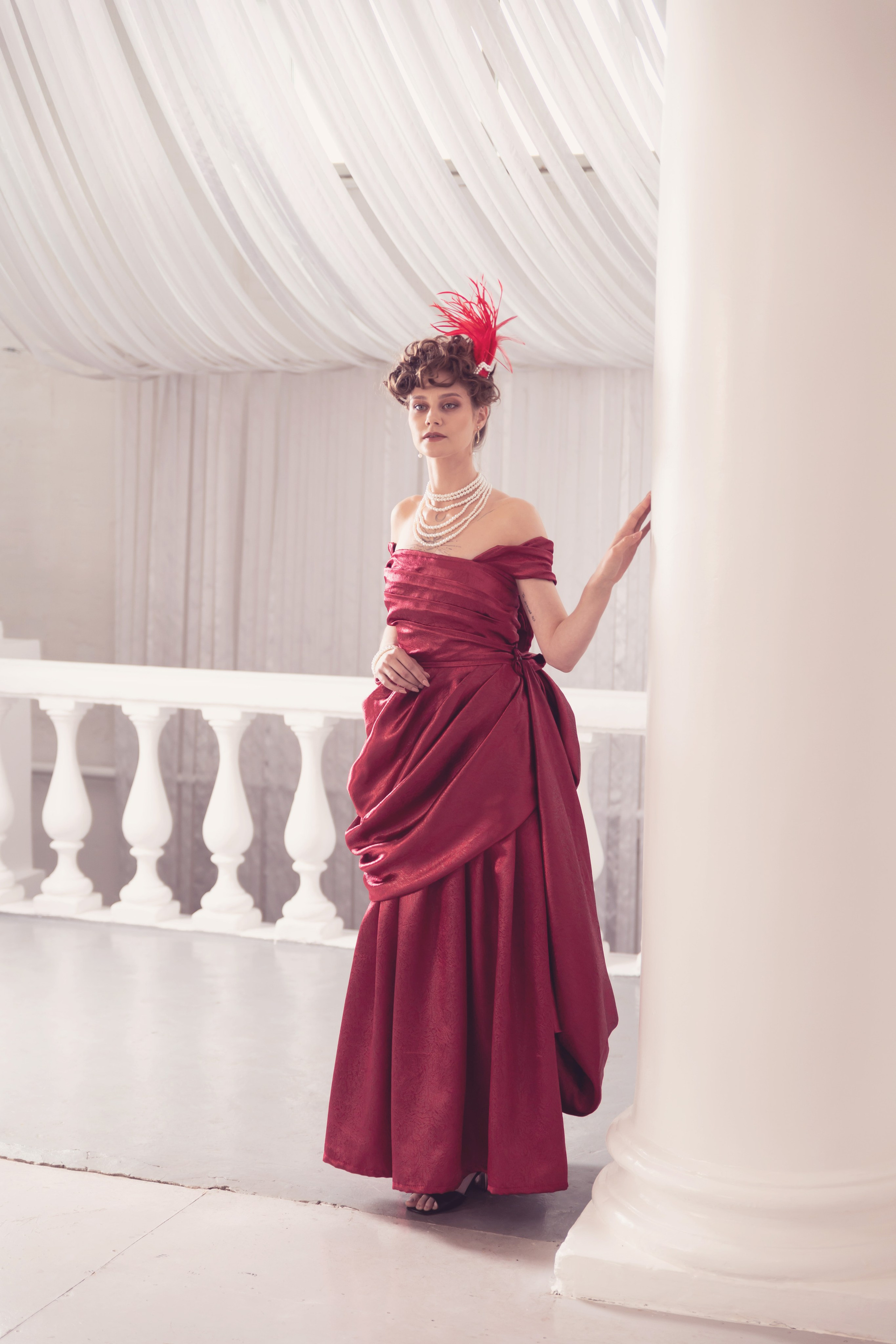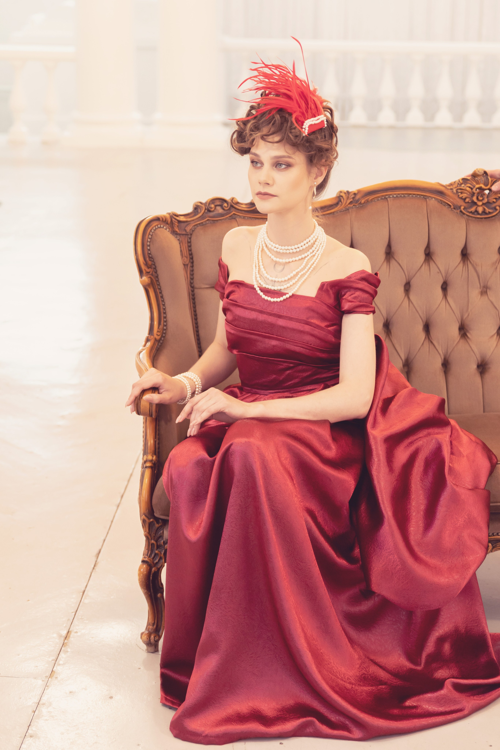 Девушка облачена в роскошное платье глубокого винно-красного цвета — символ страсти и судьбы. Блестящая ткань мягко облекает фигуру, подчёркивая талию, а драпировки создают ощущение движения и живой энергии. Открытые плечи придают образу хрупкость и чувственность.