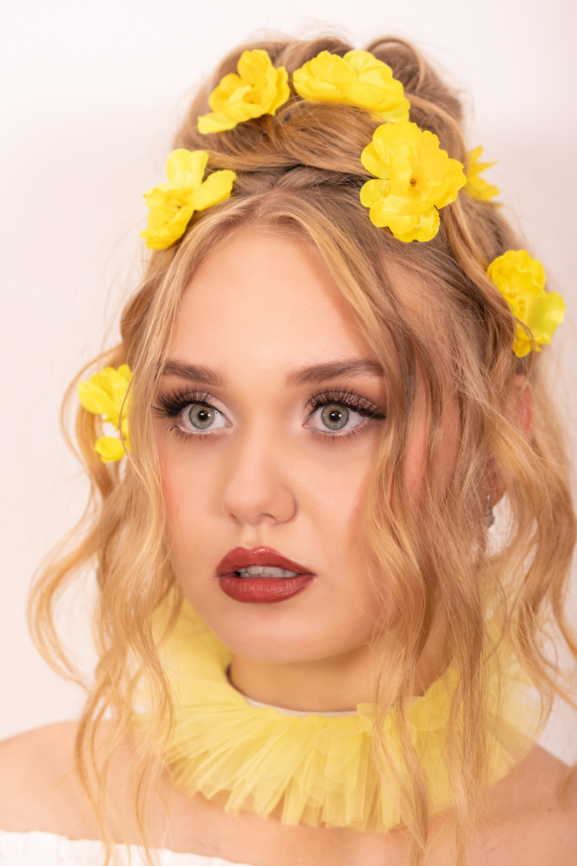 В волосах — крупные жёлтые цветы, гармонирующие с юбкой и обувью. - Причёска и макияж: