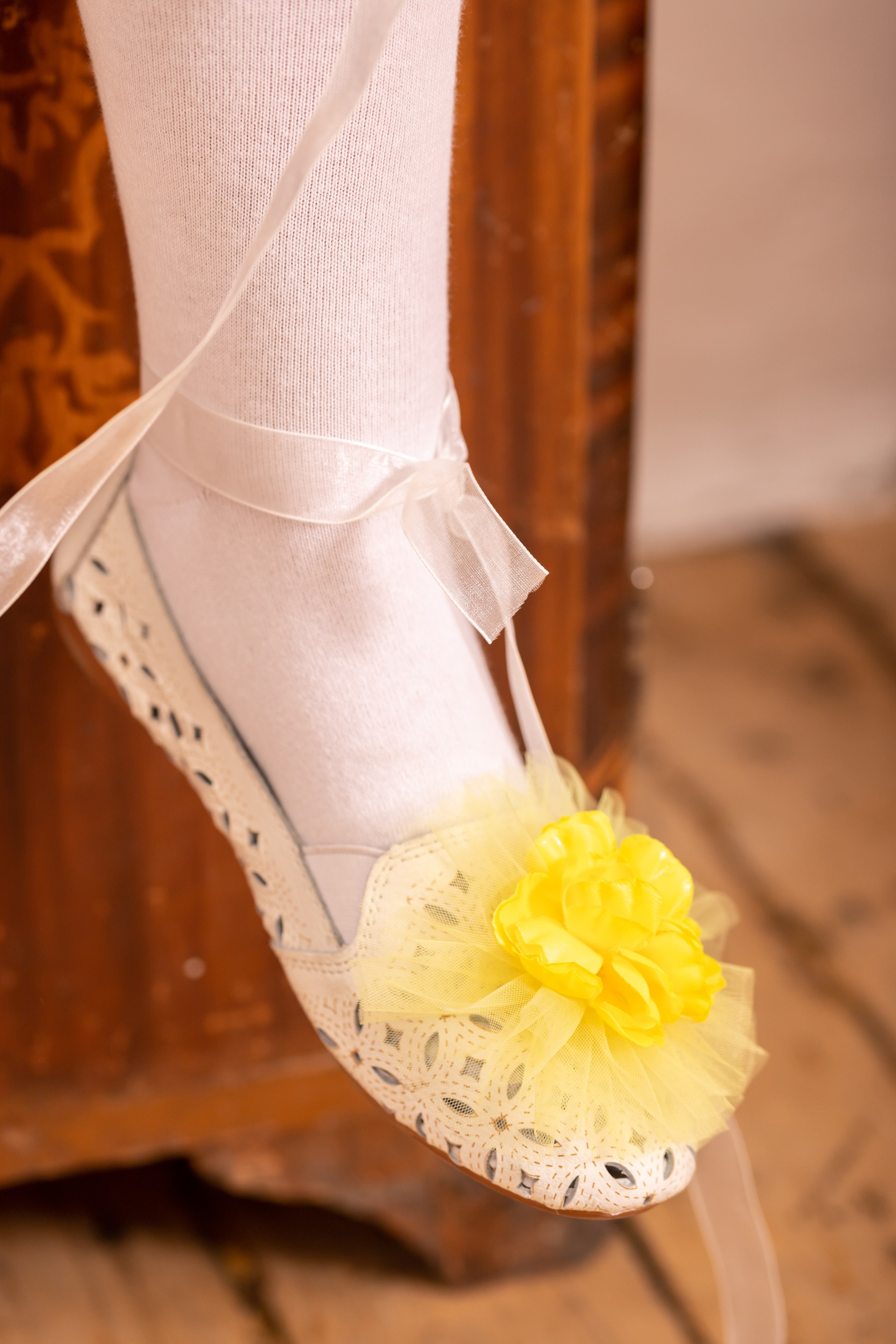 Белые балетки с жёлтым декоративным цветком на носке, перекликающимся с элементами на голове. - Аксессуары: