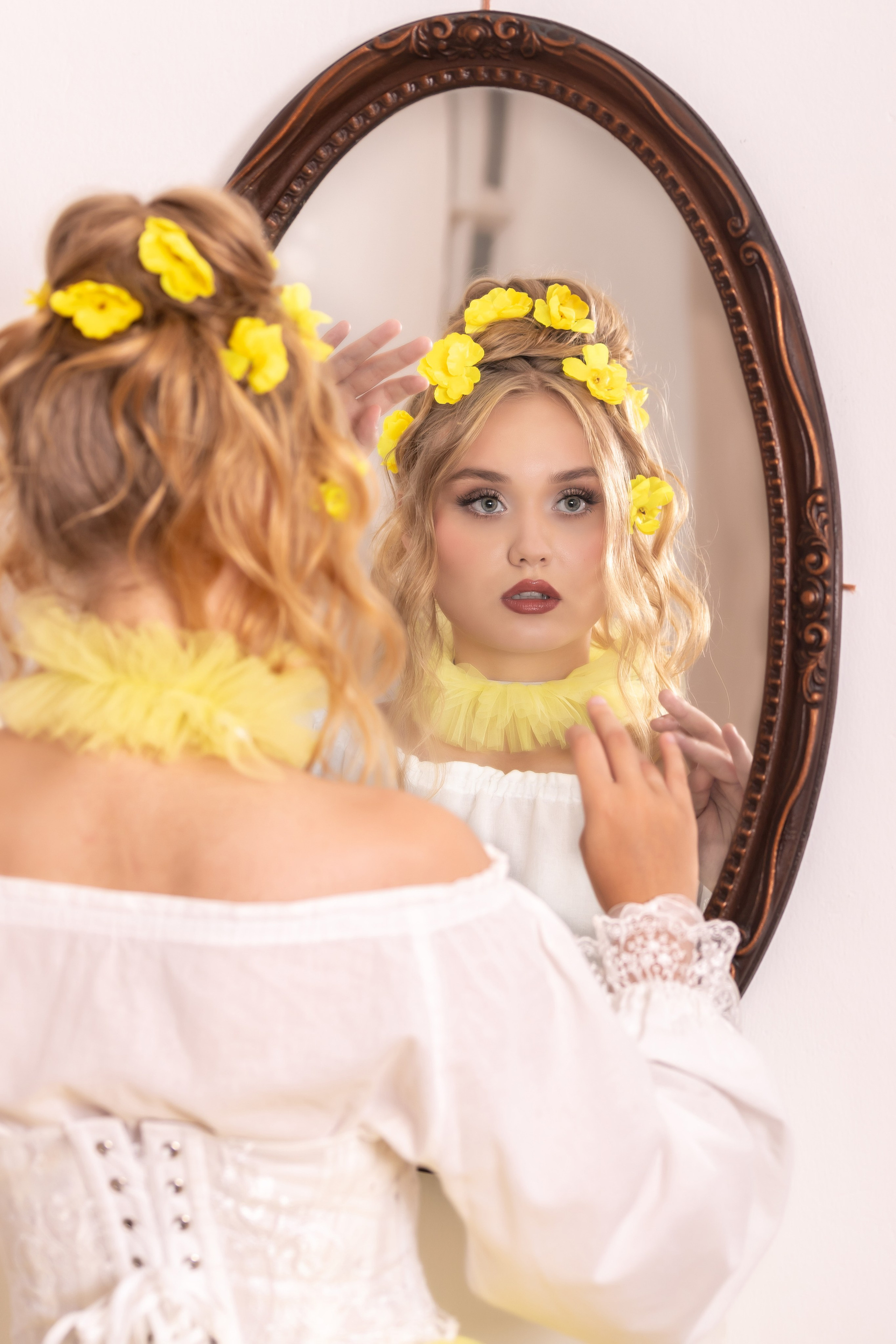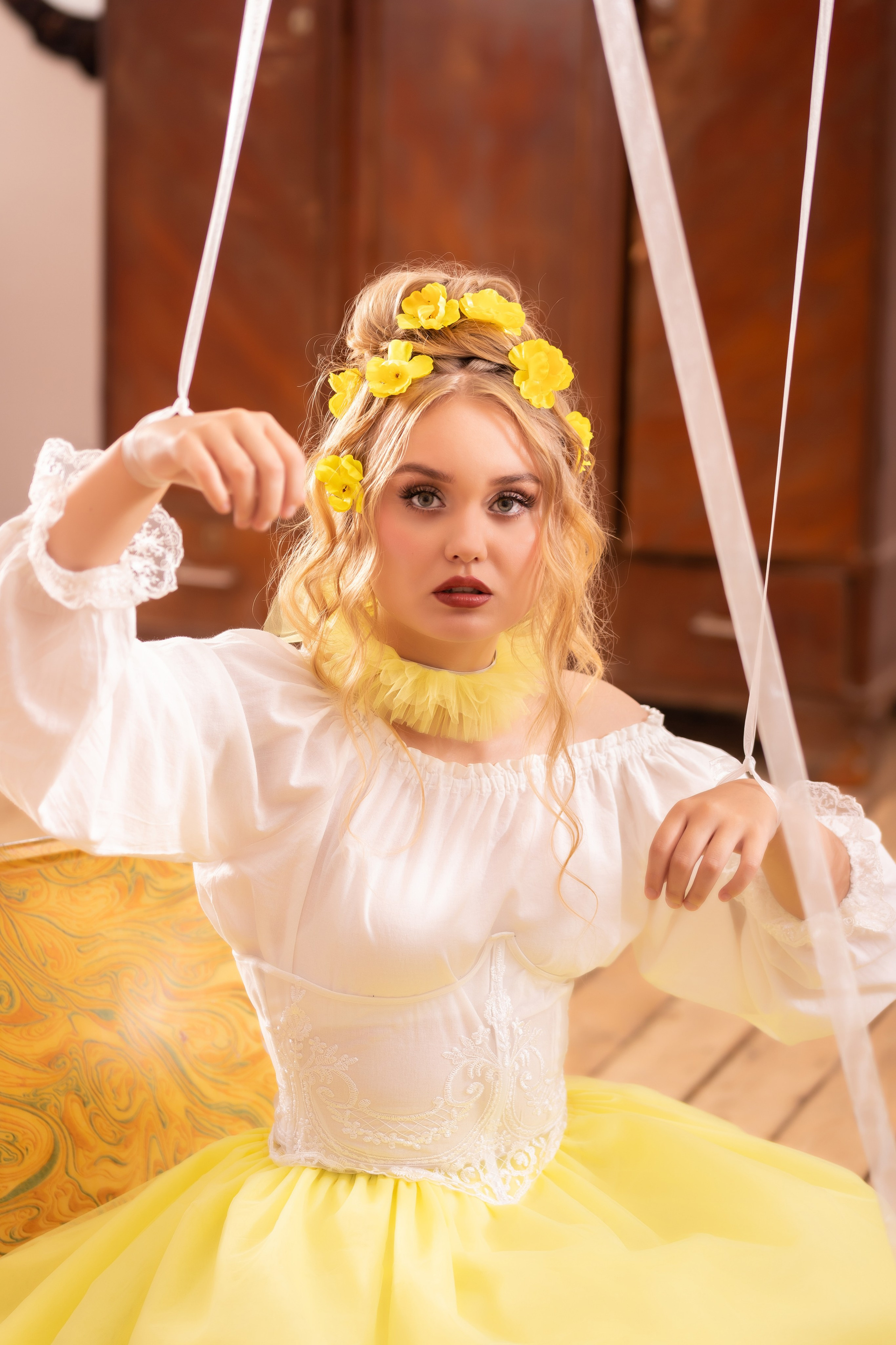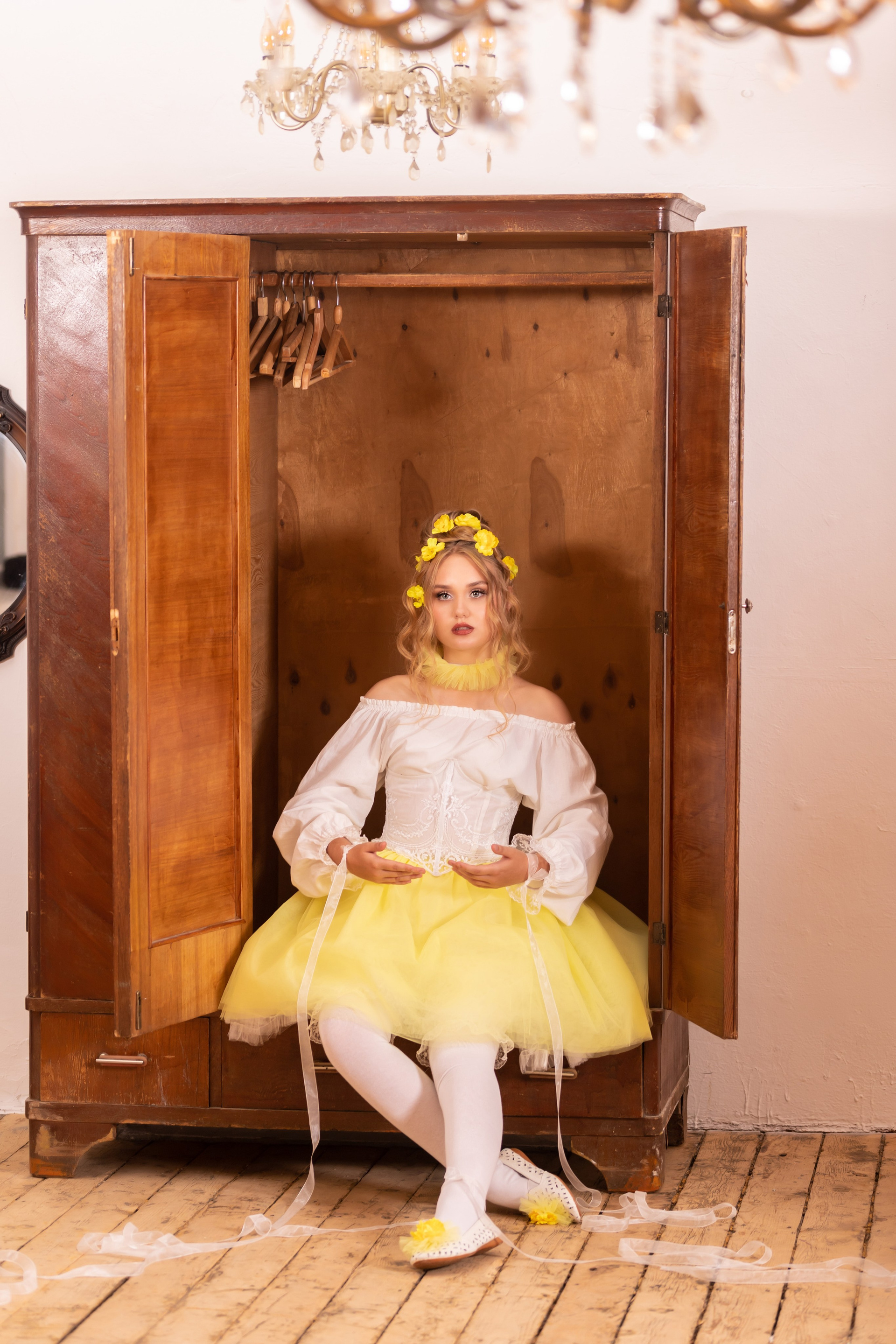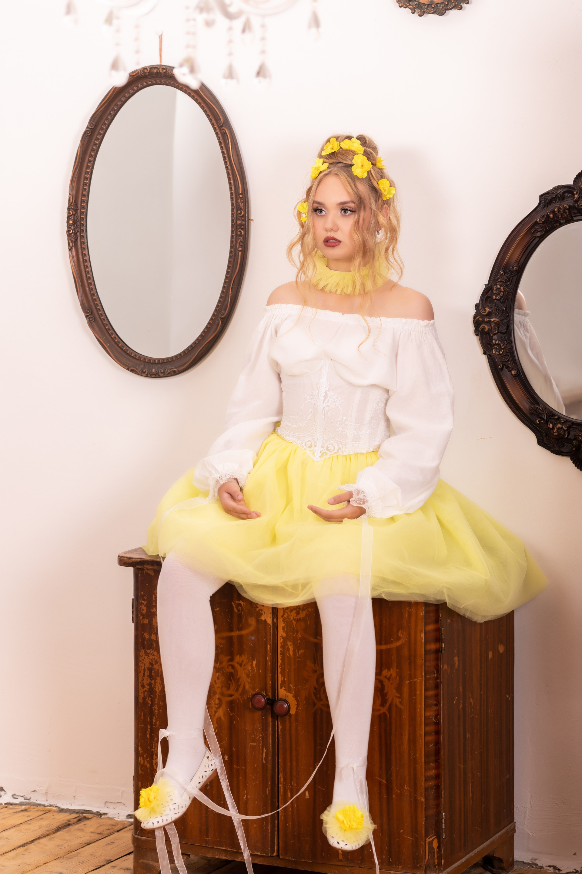 На шее — жёлтый фатиновый воротничок, создающий акцент и добавляющий театральности.