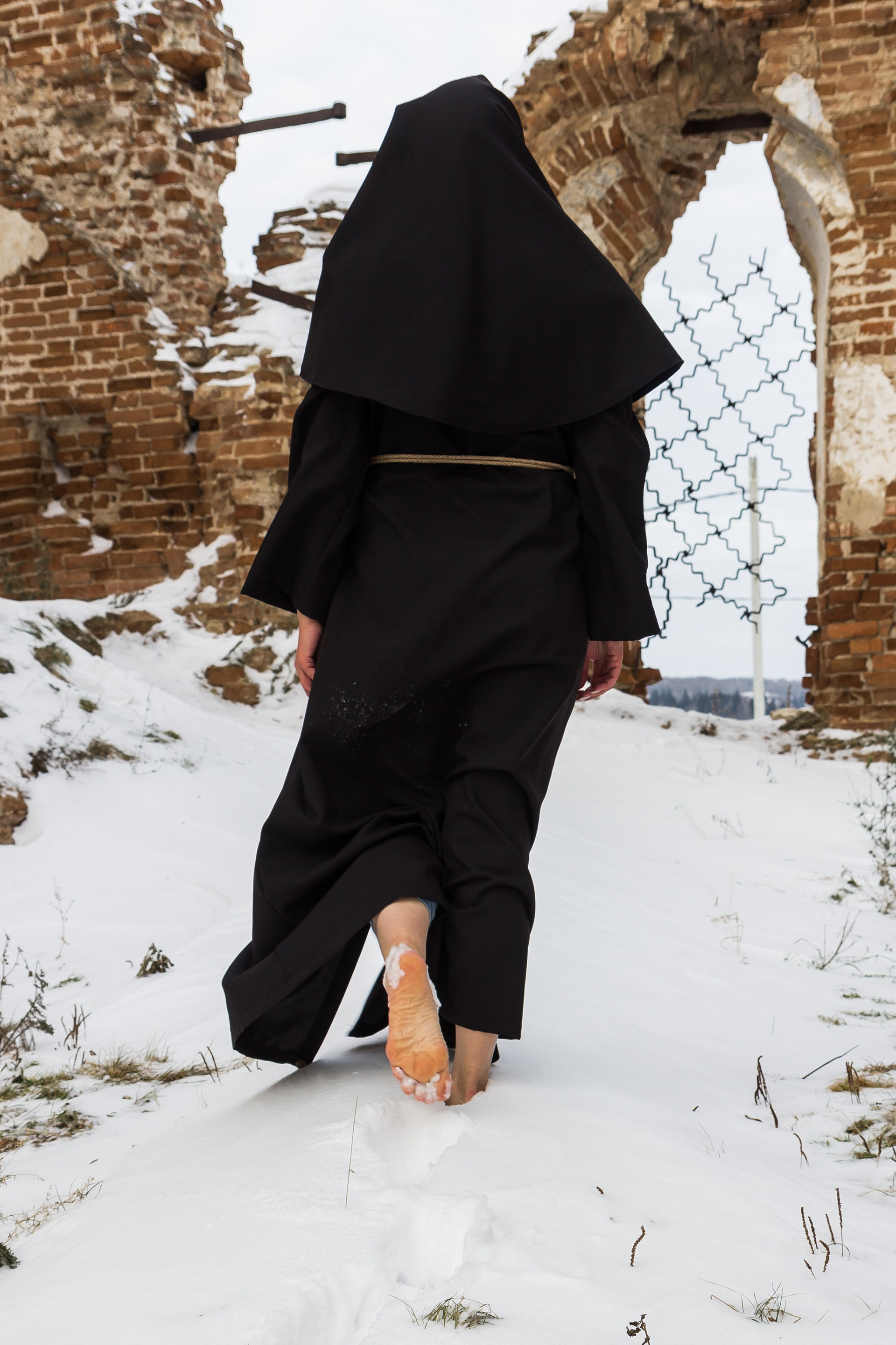 На фоне разрушенных стен и зимнего пейзажа костюм выглядит не просто религиозным, а метафорическим: он передаёт идею духовного пути, испытаний и силы веры, воплощённой через простоту и символизм каждой детали.
