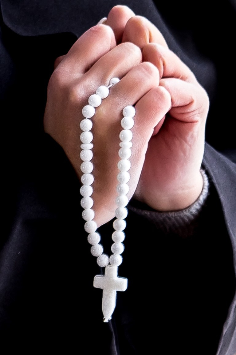 В руках — чётки с крупными белыми бусинами и крестом. Этот элемент не только дополняет композицию, но и становится смысловым центром образа — символом внутренней сосредоточенности и веры.