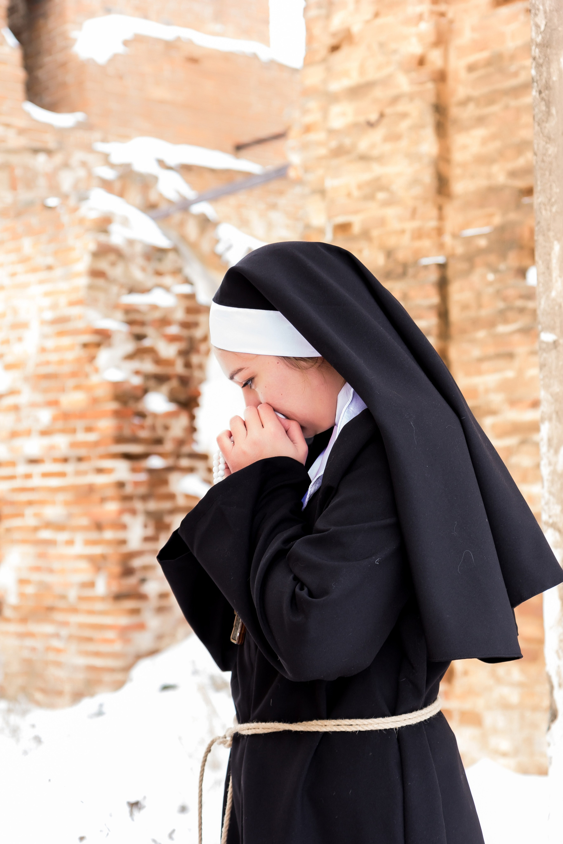 Образ девушки на фото — интерпретация монашеского облачения, созданная с вниманием к деталям и атмосфере.