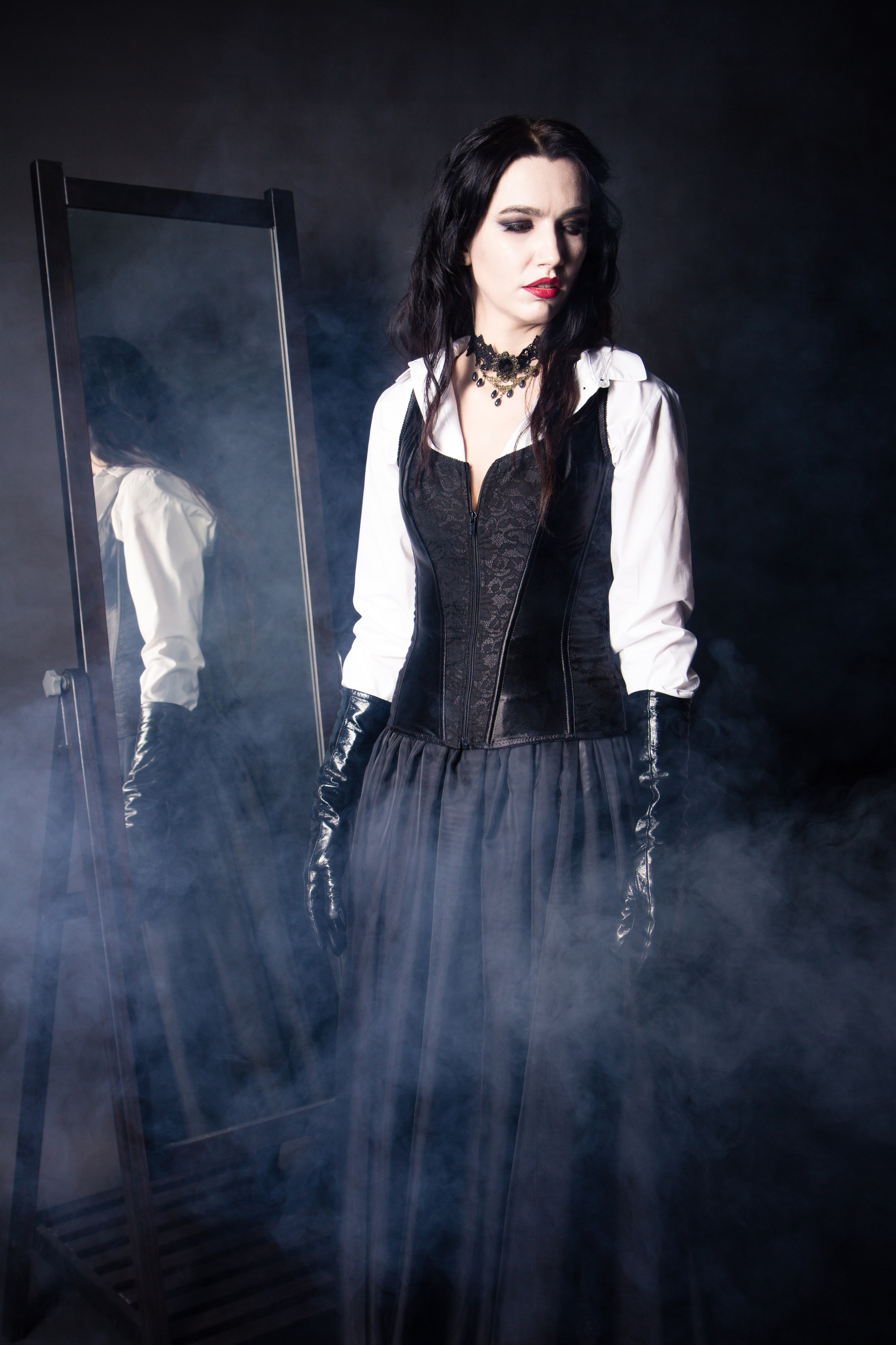 Она одета в чёрный корсет с бархатным узором, подчёркивающий фигуру и создающий строгий силуэт. Под корсетом — белая рубашка с открытым воротом, контрастирующая с тёмными элементами наряда. Длинная чёрная юбка мягко спадает вниз, придавая образу завершённость и элегантность.