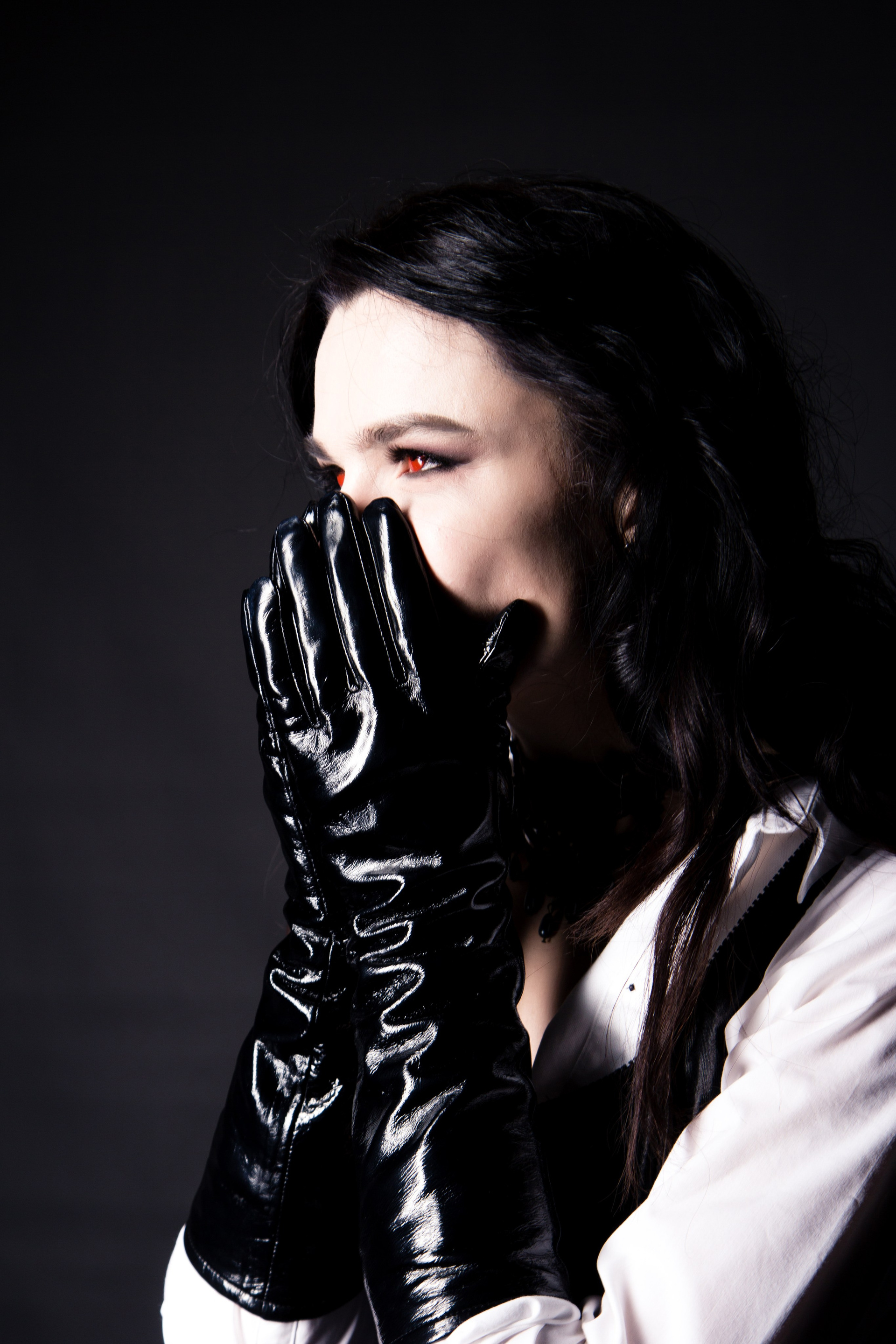 На шее — кружевное чёрное колье с декоративными элементами и подвесками в виде капель, создающее акцент и усиливающее готическое настроение. Длинные лакированные перчатки до локтя добавляют блеска и выразительности, подчёркивая руки и жесты.